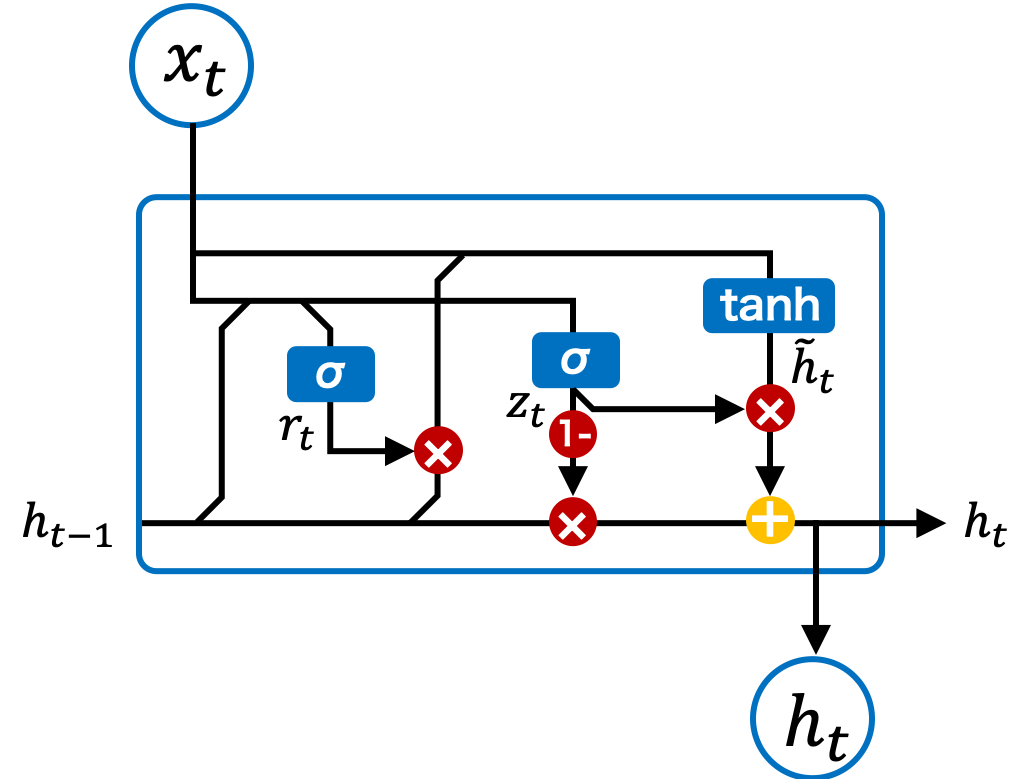 ・rt(リセット・ゲート・ベクトル)によってht-1(前の情報)が減衰される点が異なる。