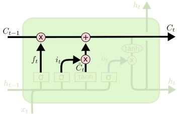 - ft(忘却ゲート・ベクトル)とCt-1(旧コンテキスト)のアダマール積
