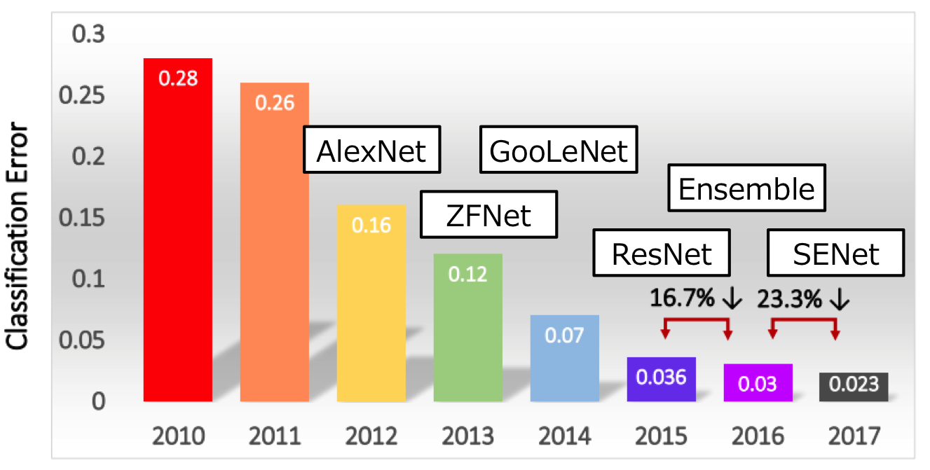- 初めて人間のエラー率 5% を上回る精度を達成。