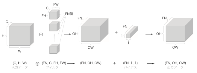 入力サイズ(H, W)、フィルタ・サイズ(FH, FW)、出力サイズ(OH, OW)
