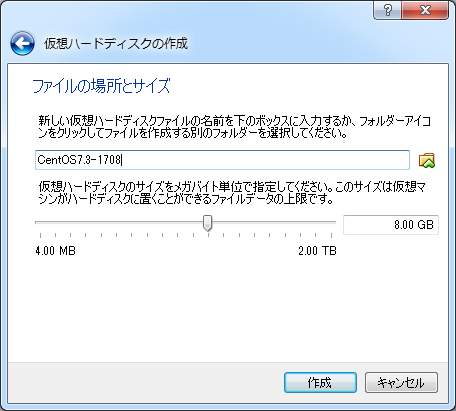 ファイルの場所とサイズについては、この内容で問題ないならそのまま「作成」をクリック。