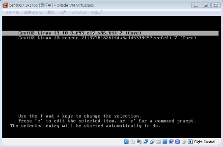「CentOS Linux (3.10.0-693.e17.x86_64) 7 (Core)」を選択し、Enterキーを押下。
