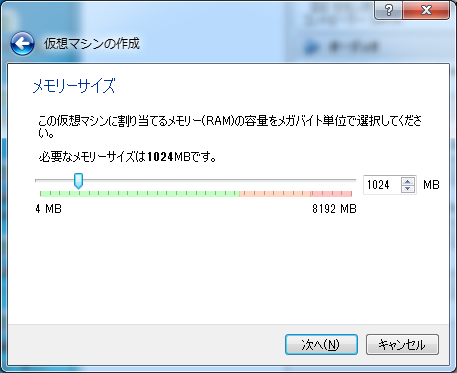 デフォルトの512MBだとアプリの実行が苦しいので1024MBを指定し、「次へ」をクリック。