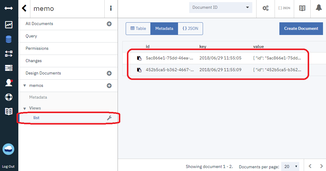 先ほど作成した「Cloudant NoSQL DB-memo」を押下する。