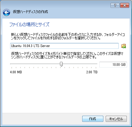 ファイルの場所とサイズについては、この内容で問題ないならそのまま「作成」をクリック。