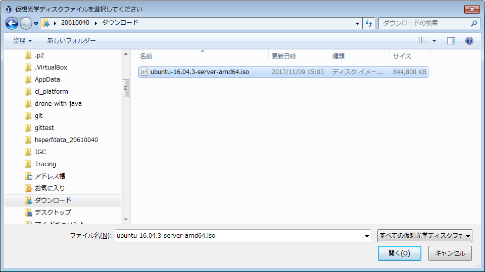 「7」で保存したISOファイルを選択し、「開く」をクリック。