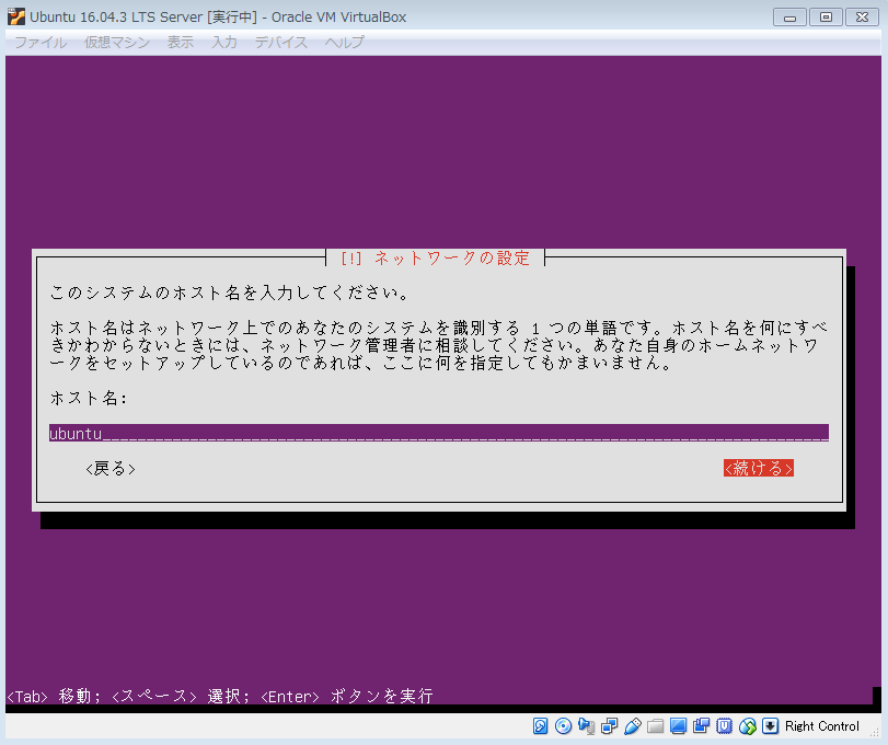 任意のホスト名を入力後、「続ける」を選択しEnterキーを押下。