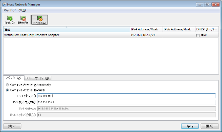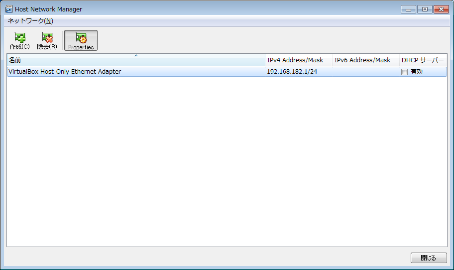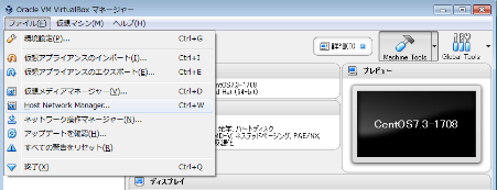 VirtualBox?のメニューバーから「ファイル」>「Host Network Manager環境」を選択。