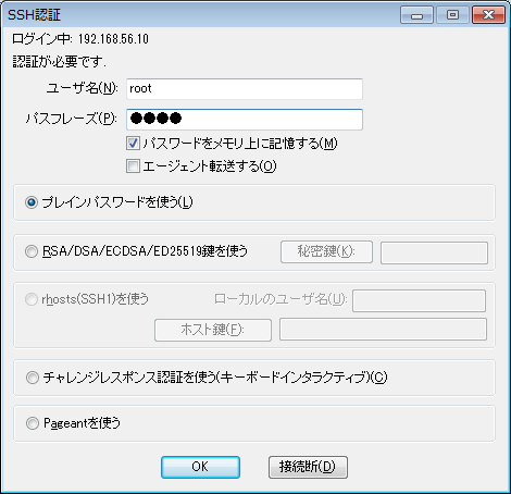 ユーザ名とパスワード(下の図ではパスフレーズ)を入力してOKを押下。