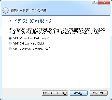 「仮想ハードディスクを作成する」が選択されていることを確認し、「作成」をクリック。