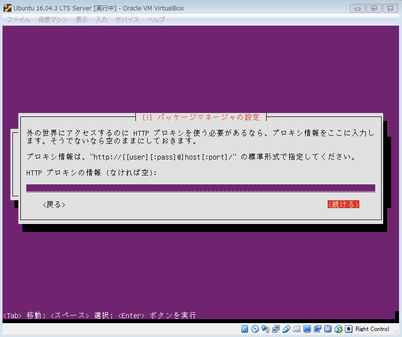 プロキシの情報を入力後「続ける」を選択しEnterキーを押下。