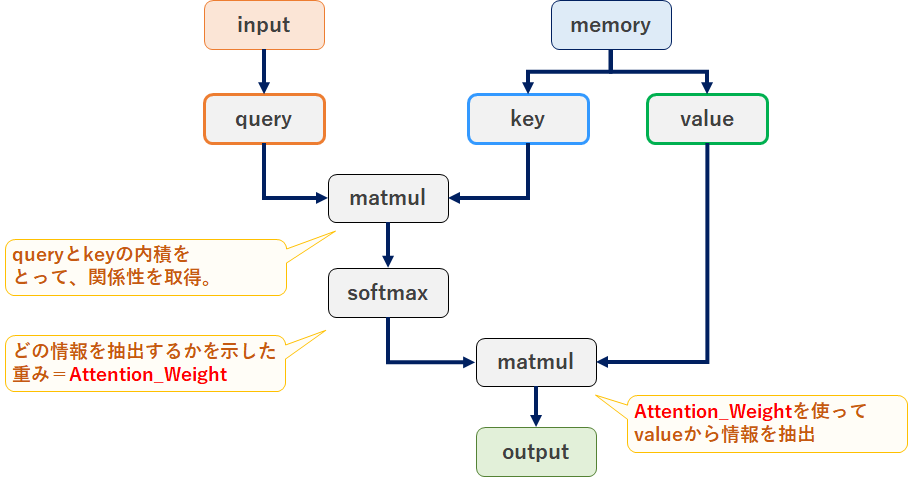 Attention とは query によって memory(key, value) から必要な情報を選択的に引っ張ってくること。