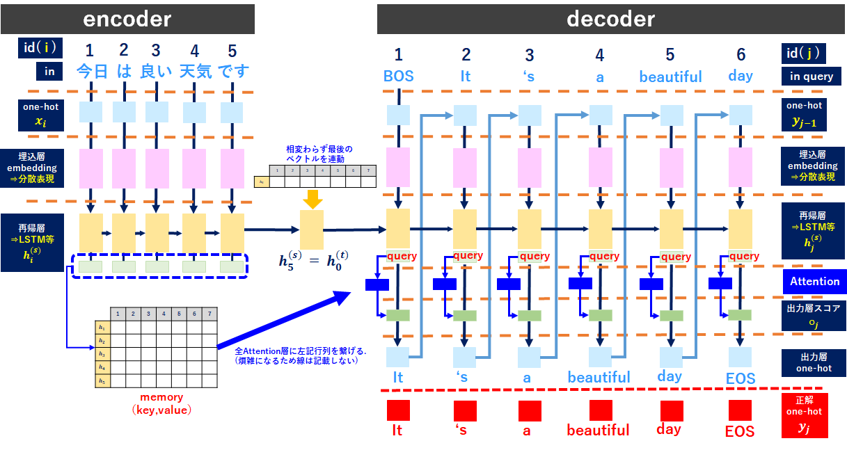 - 一番最後の再帰段階のRNN層→Attention層→出力層からの最終的な出力は[EOS]